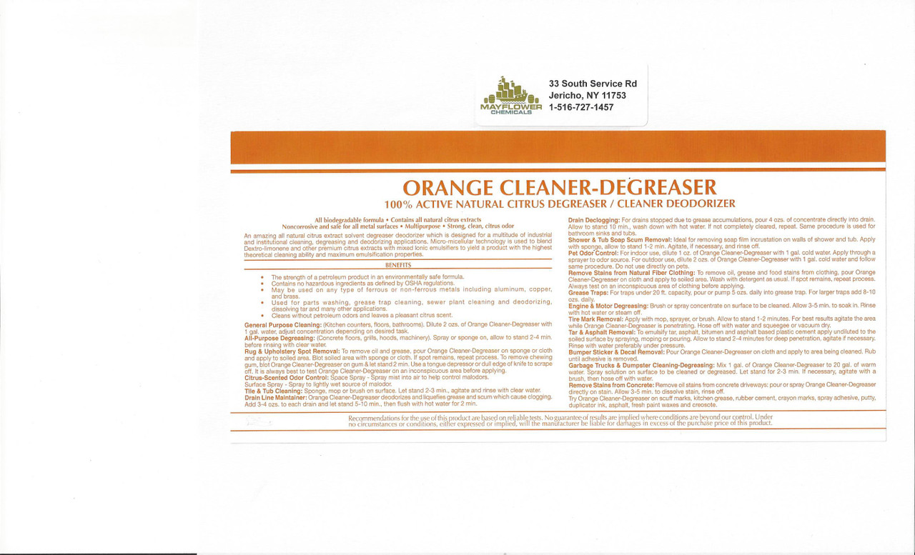 Is your household in need of cleaning and degreasing? Are there blemishes that need to be removed from your rugs, carpets, and upholstery? Do you need your home or work area deodorized? Is soap scum a problem? Do you need to remove stains from natural fiber clothing? Does your engine need degreasing? Are there tire marks that need to be removed? Maybe you need to get rid of tar. Perhaps you want to expunge decals and bumper stickers. Are you required to clean and degrease dumpsters? Garbage trucks? Does your concrete have stains you want to eliminate? Do you need to immediately unclog drains? Do you need all this in an ecofriendly, EPA-Approved formula? To say our Orange Cleaner-Degreaser is multipurpose would be a huge understatement.